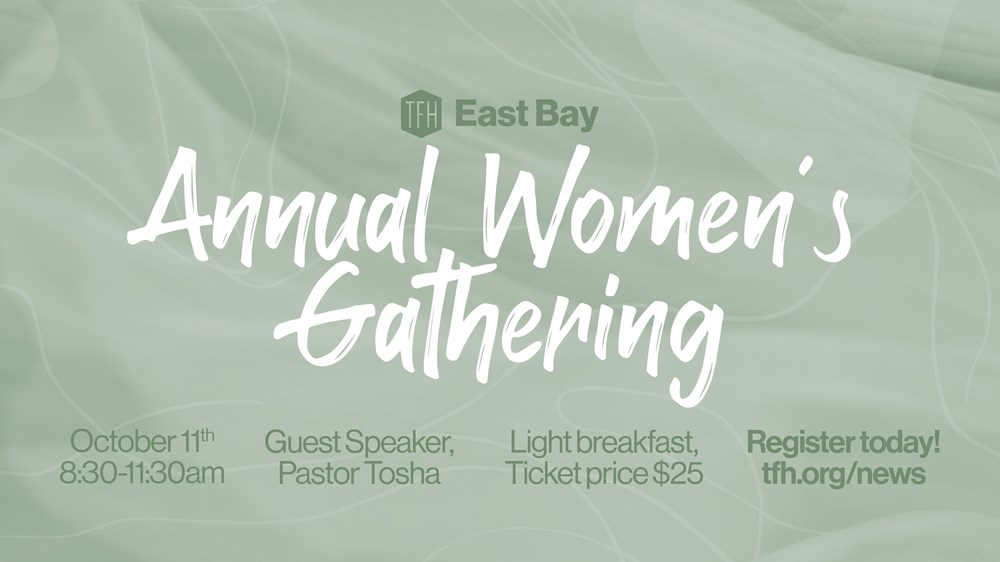 Hey ladies! We’d love for you to join us at TFH East Bay Annual Women’s Gathering on Saturday, October 11, from 8:30–11:30am. It’ll be a beautiful morning together with worship, community, and a special word from our guest, Pastor Tosha. A light breakfast is included, and the cost is $25 per person.